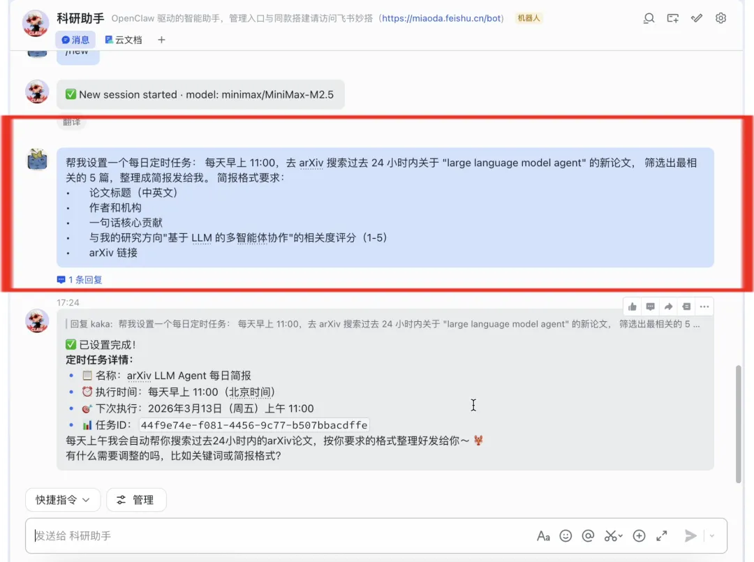 如果你每天还在手动刷 arXiv、Google Scholar,这一步可以直接帮你节省 90% 时间。你只需要给 OpenClaw 一条指令: