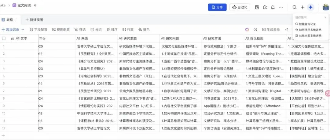 帮我搭建一个飞书多维表格,字段如下:- 论文标题 (Text)- 作者 (Text)- 发布年份 (Number)- 期刊/会议 (Select)- PDF 链接 (URL)- AI 核心摘要(300字)- 创新点 / 技术路线 / 实验结果- 阅读状态(待读/研读中/已归档)配置完成后,你只需发送:把刚才那篇 Multi-Agent 论文加入到「2026重点论文库」,系统将自动完成阅读、提炼、录入全流程。