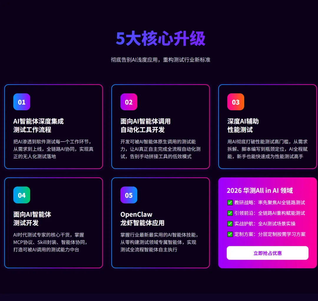 面对 OpenClaw这类AI智能体的冲击,我们华测教育第一时间完成了2026 战略级重磅升级,将 AI 深度集成到软件测试全流程,帮你从 “测试执行者” 升级为 “AI 时代不可替代的测试专家”。核心升级覆盖五大维度,构建全链路 AI 测试能力体系: