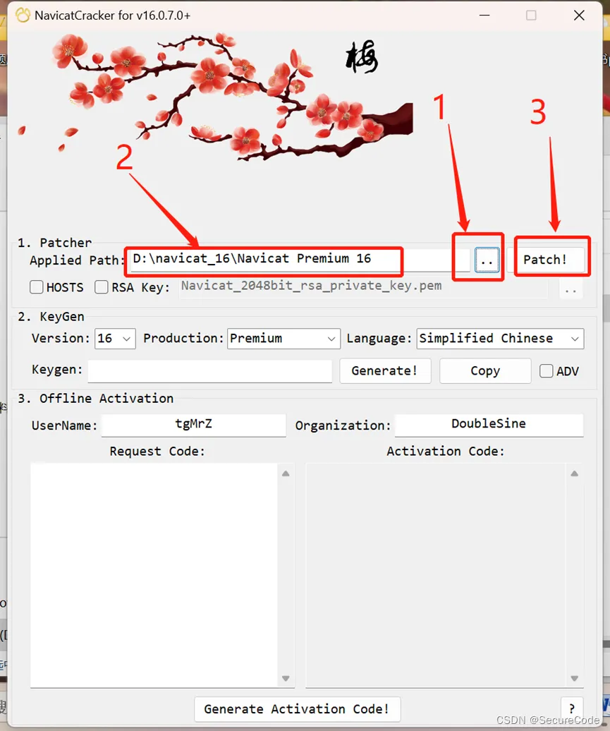 4. 按步骤进行,先1选择navicat16的安装路径,然后2检查路径是否正确,再3点击“Patch”。