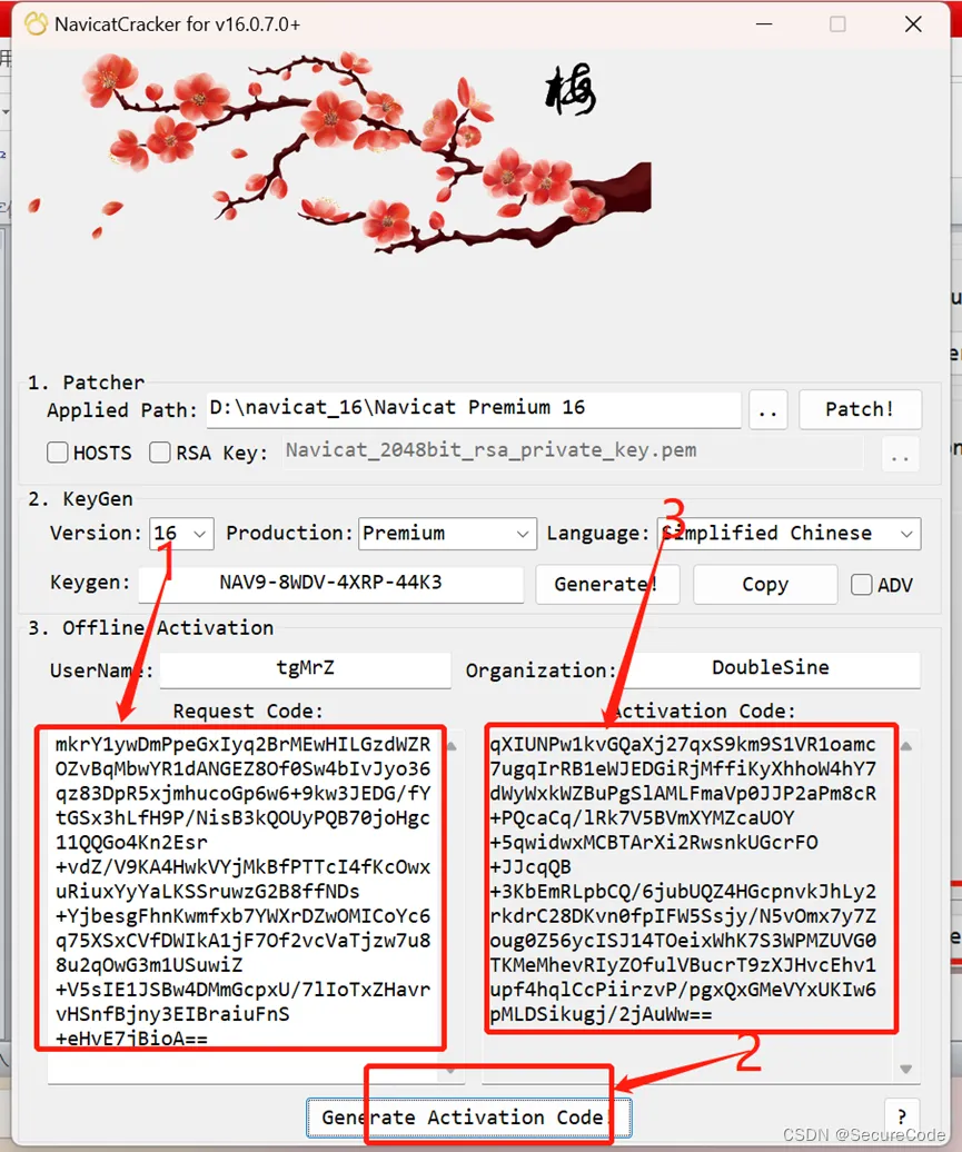 11. 这时回到工具处,将刚刚复制的请求码复制到1处,然后点击2处“Generate Activation Code”,此时在3处会生成一串字符,复制3处的字符串。