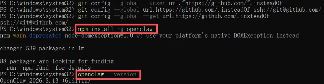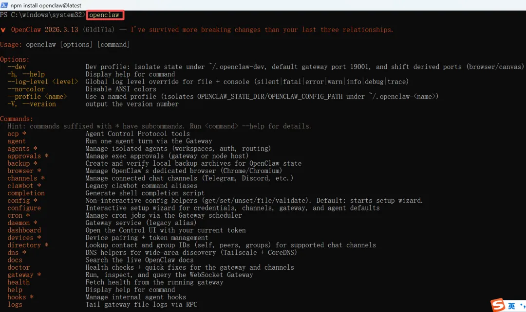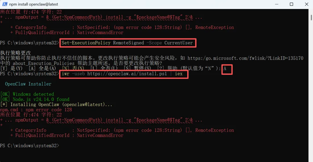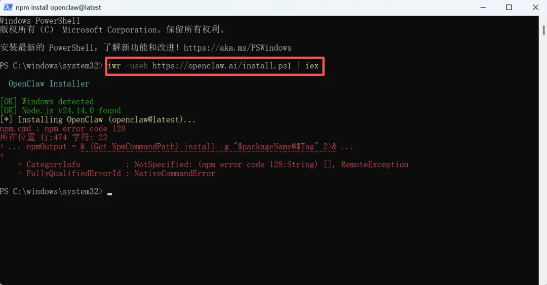 手把手教你安装OpenClaw(亲测)官网下载地址:https://nodejs.org/zh-cn/download/我的电脑是Windows系统,点击下载 Windows安装程序(.msi)双击下载下来的安装包node-v24.14.0-x64.msi,开始安装。一路默认点击下一步Next,直到安装完成,点击Finish。Node.js安装完成后,在电脑终端命令行输入node -v并回车,确认安装成功的版本。从截图中可以看出,我安装的是v24.14.0版本。官网下载地址:https://git-scm.com/install/windows下载Git for Windows/x64 Setup。双击下载下来的安装包Git-2.53.0.2-64-bit.exe,开始安装。一路默认点击下一步Next,直到安装完成,点击Finish。Git安装完成后,在电脑终端命令行输入git --version并回车,确认安装成功的版本。从截图中可以看出,我安装的是git version 2.53.0.windows.2版本。选择以管理员身份运行 Windows PowerShell输入官方命令:iwr -useb https://openclaw.ai/install.ps1 | iex开启PowerShell的脚本执行权限,执行这个命令:Set-ExecutionPolicy RemoteSigned -Scope CurrentUser重新执行最开始的官方命令:iwr -useb https://openclaw.ai/install.ps1 | iex直接用全局安装命令,安装openclaw最新版本:npm install -g openclaw用命令检查一下:openclaw --version可以看出,我安装的openclaw版本是:OpenClaw 2026.3.13版本。OpenClaw本身是一个命令行工具,默认没有图形界面。