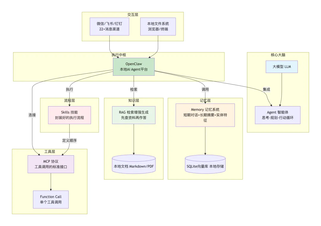 Agent是整体概念,OpenClaw是Agent的具体实现 RAG是给Agent提供外部知识的方法 Memory是让Agent记住历史的方法 MCP是标准化工具调用的协议(OpenClaw选择不用) Skills是OpenClaw独创的、封装了执行流程的能力模块 OpenClaw是一个把以上所有能力整合在一起、开源免费、能跑在你电脑上的智能体平台