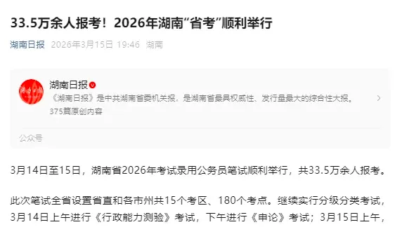 2026年湖南省公务员考试笔试已于3月15日全部结束,根据官方相关平台公布,全省15个考区共有22.5万人参考,同比去年增加约4万人。
