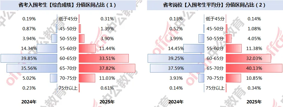 其中岗位【入围考生平均分】区间占比最大从去年的“60-65分”区间变为“65-70分”区间,2025年“65-70分”占比达40.13%,同比去年增长6.7%。