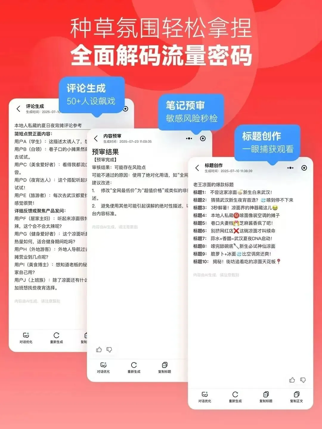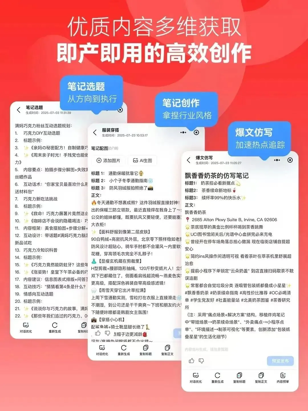 高转化赋能:AI能够自动匹配爆款元素,不管是标题的吸引力、正文的种草节奏,还是话题标签的适配度,都能精准踩中流量密码,显著提升笔记曝光量和种草转化率。