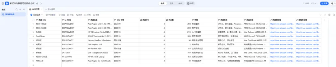 到最后从价格、规格、评分、评论、销量,再到卖点规格,商品图链接,详情页链接一应俱全。