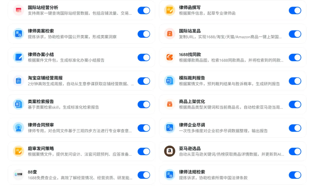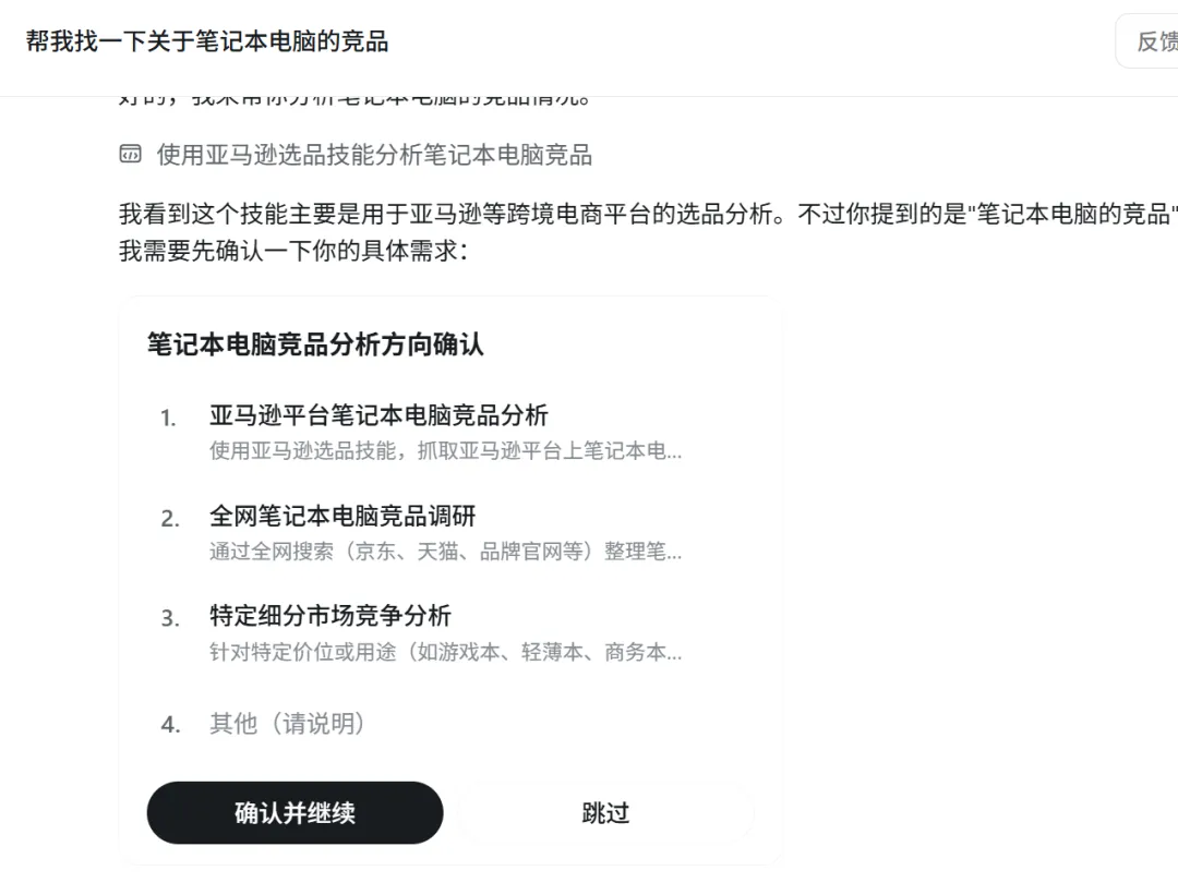 比如针对1688,就专门预置了专门的选品、找同款、商品信息分析等等核心技能Skill。