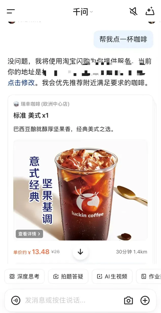 从年前的千问点餐,打通淘宝闪购,AI直接帮你点餐下单。