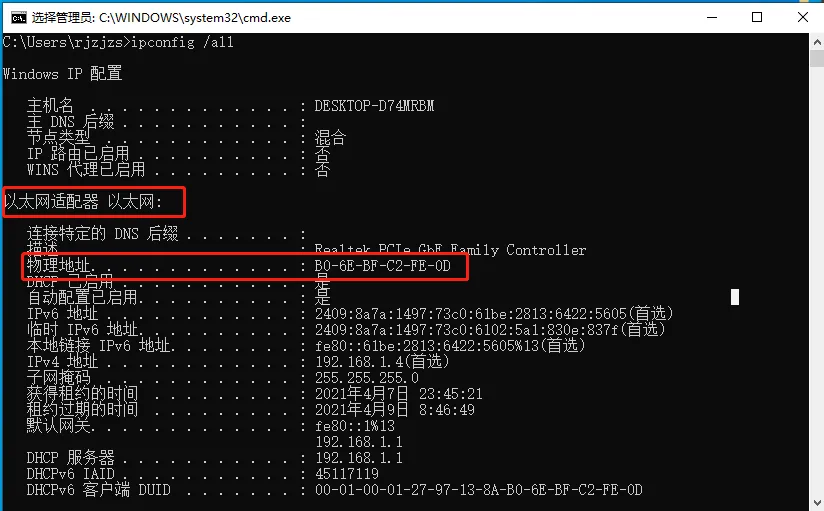 5.找到以太网的物理地址,不要关闭此界面。