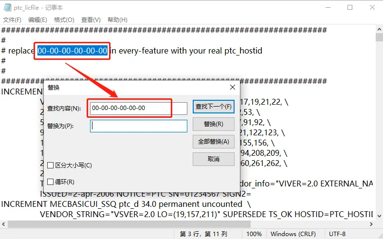 11.将以太网物理地址输入到下图所示的选项中(输入的内容千万不要有空格),然后点击【全部替换】。