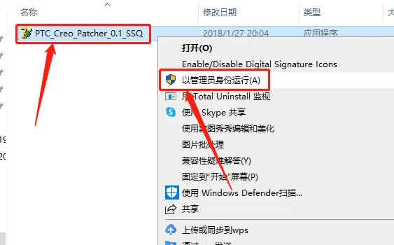 23.鼠标右击【PTC_Creo_Patcher_0.1_SSQ】注册机,选择【以管理员身份运行】。