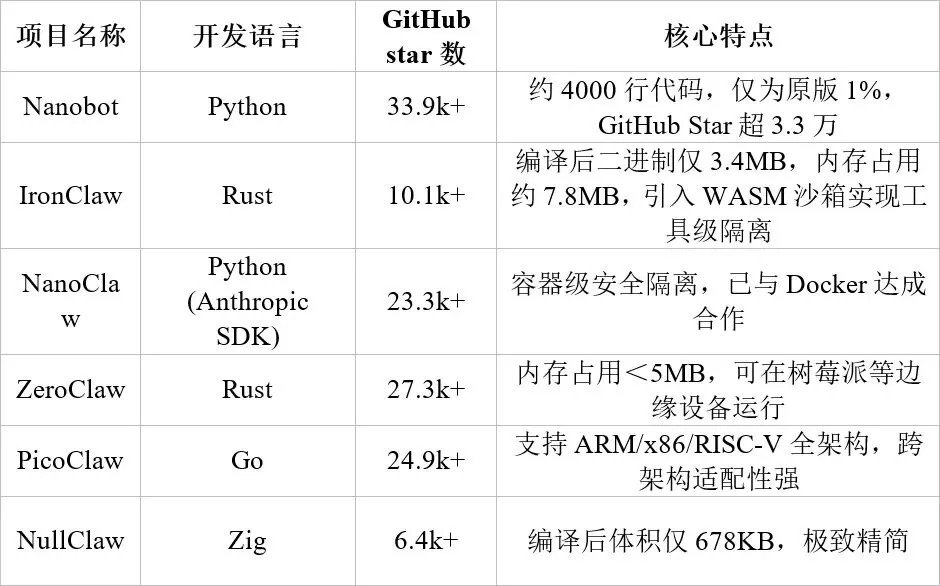 OpenClaw原版基于TypeScript/Node.js构建,存在43万行代码、1.5GB运行内存、6秒启动时间的问题,虽功能完备,但个人开发者和中小团队部署门槛较高。因此涌现多款轻量化替代项目,实现从云服务器到边缘设备的全场景覆盖。