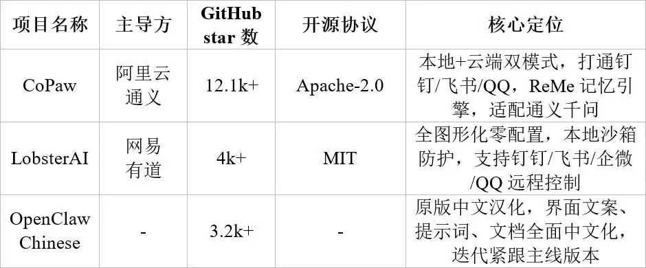 “龙虾家族”衍生开源项目的主要类型
