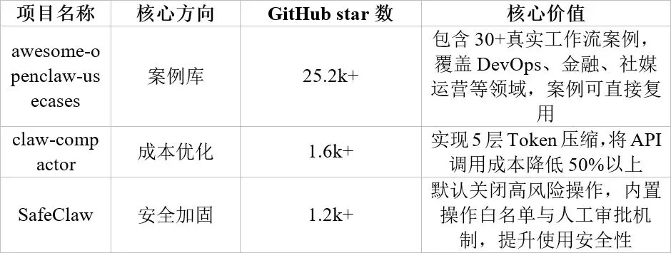 围绕OpenClaw核心能力,社区涌现出一批配套工具项目,从用例复用、成本控制、安全保障多维度为开发者赋能,助力OpenClaw生态高效落地。