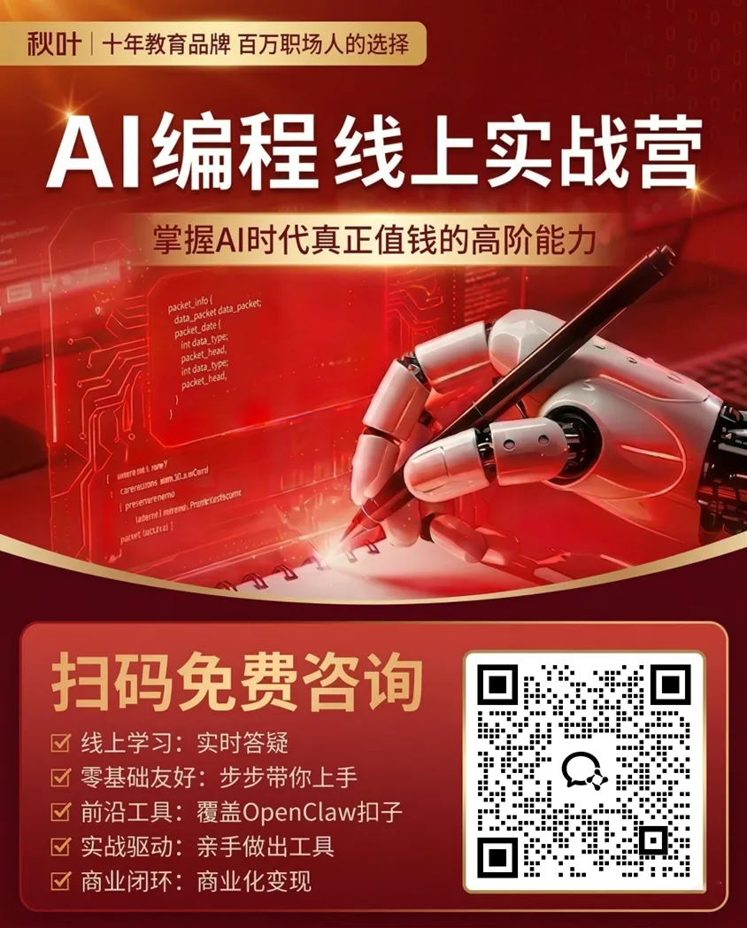 因为我们已经把 OpenClaw 的避坑指南、安全玩法、能直接落地的业务场景,全都浓缩进了秋叶团队的重磅新课《秋叶 AI 编程线上实战营》里!