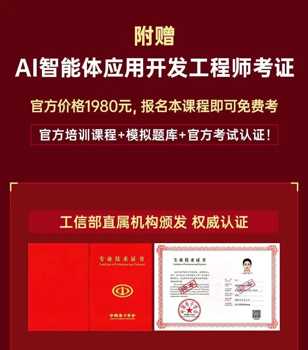 🎁更有限时重磅福利:报名即送价值 1980 元的【智能体应用开发工程师证书】免费考证资格!