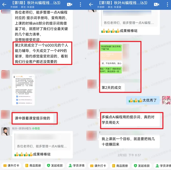 甚至有学员刚学完第二天,就直接用课堂上现学的 AI 技能,一单变现了 6000 元!