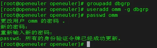 # groupadd dbgrp# useradd omm -g dbgrp# passwd omm