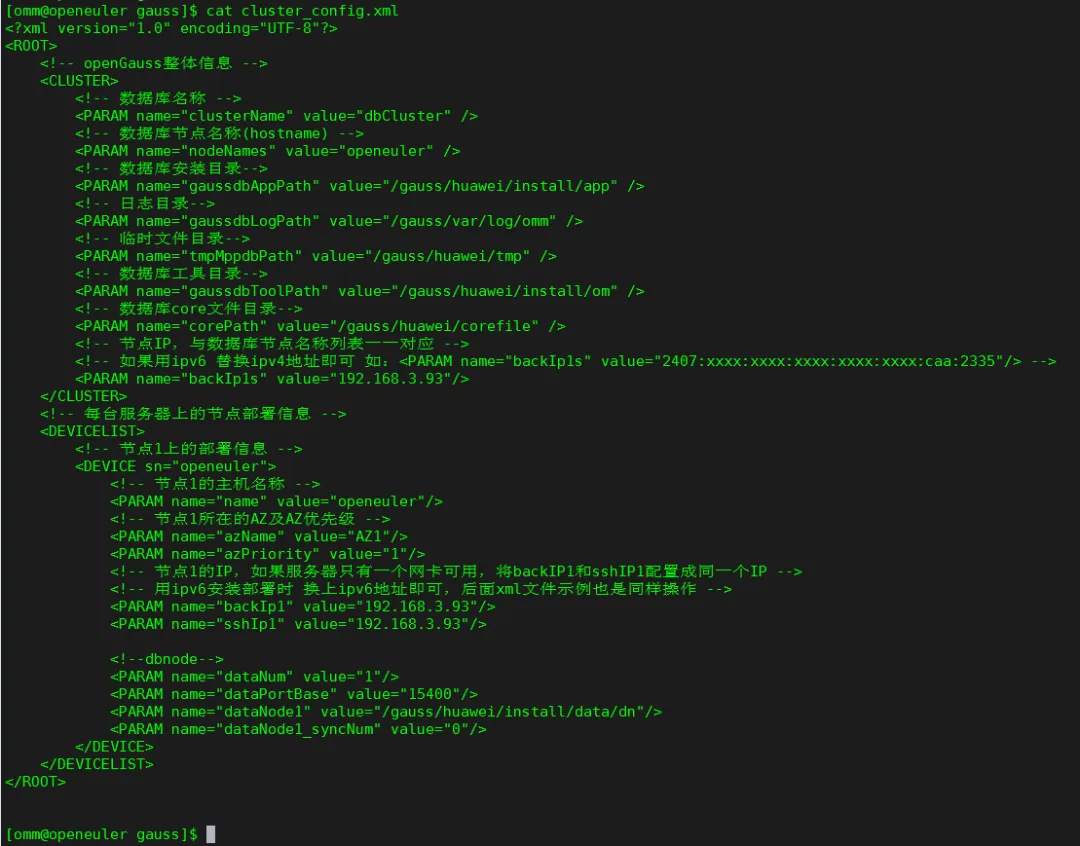 <?xml version="1.0" encoding="UTF-8"?><ROOT><!-- openGauss整体信息 --><CLUSTER><!-- 数据库名称 --><PARAMname="clusterName"value="dbCluster" /><!-- 数据库节点名称(hostname) --><PARAMname="nodeNames"value="openeuler" /><!-- 数据库安装目录--><PARAMname="gaussdbAppPath"value="/gauss/huawei/install/app" /><!-- 日志目录--><PARAMname="gaussdbLogPath"value="/gauss/var/log/omm" /><!-- 临时文件目录--><PARAMname="tmpMppdbPath"value="/gauss/huawei/tmp" /><!-- 数据库工具目录--><PARAMname="gaussdbToolPath"value="/gauss/huawei/install/om" /><!-- 数据库core文件目录--><PARAMname="corePath"value="/gauss/huawei/corefile" /><!-- 节点IP,与数据库节点名称列表一一对应 --><!-- 如果用ipv6 替换ipv4地址即可 如:<PARAM name="backIp1s" value="2407:xxxx:xxxx:xxxx:xxxx:xxxx:caa:2335"/> --><PARAMname="backIp1s"value="192.168.3.93"/></CLUSTER><!-- 每台服务器上的节点部署信息 --><DEVICELIST><!-- 节点1上的部署信息 --><DEVICEsn="openeuler"><!-- 节点1的主机名称 --><PARAMname="name"value="openeuler"/><!-- 节点1所在的AZ及AZ优先级 --><PARAMname="azName"value="AZ1"/><PARAMname="azPriority"value="1"/><!-- 节点1的IP,如果服务器只有一个网卡可用,将backIP1和sshIP1配置成同一个IP --><!-- 用ipv6安装部署时 换上ipv6地址即可,后面xml文件示例也是同样操作 --><PARAMname="backIp1"value="192.168.3.93"/><PARAMname="sshIp1"value="192.168.3.93"/><!--dbnode--><PARAMname="dataNum"value="1"/><PARAMname="dataPortBase"value="15400"/><PARAMname="dataNode1"value="/gauss/huawei/install/data/dn"/><PARAMname="dataNode1_syncNum"value="0"/></DEVICE></DEVICELIST></ROOT>
