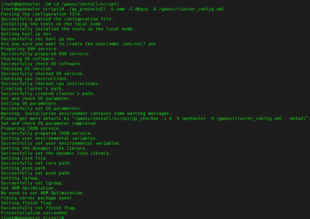 # cd /gauss/install/script# ./gs_preinstall -U omm -G dbgrp -X /gauss/cluster_config.xml