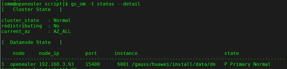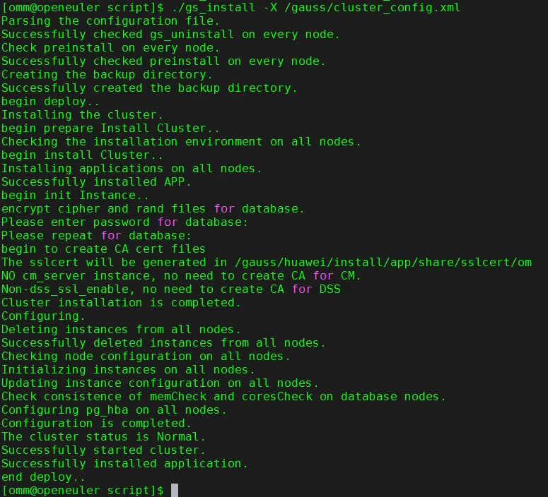 su - ommcd /gauss/install/script./gs_install -X /gauss/cluster_config.xml