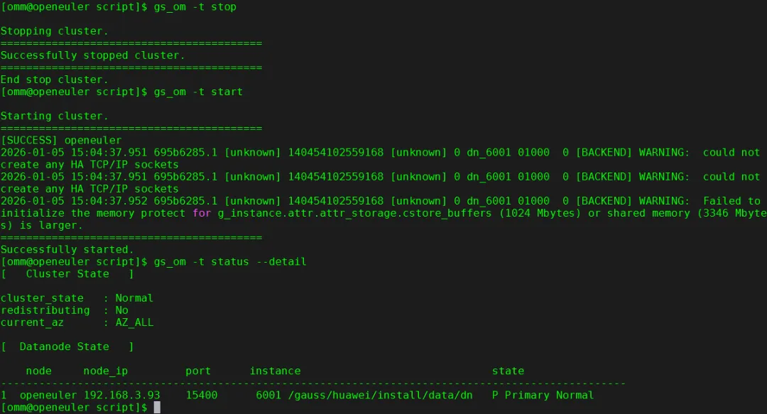 $ gs_om -t stop$ gs_om -t start$ gs_om -t status –detail