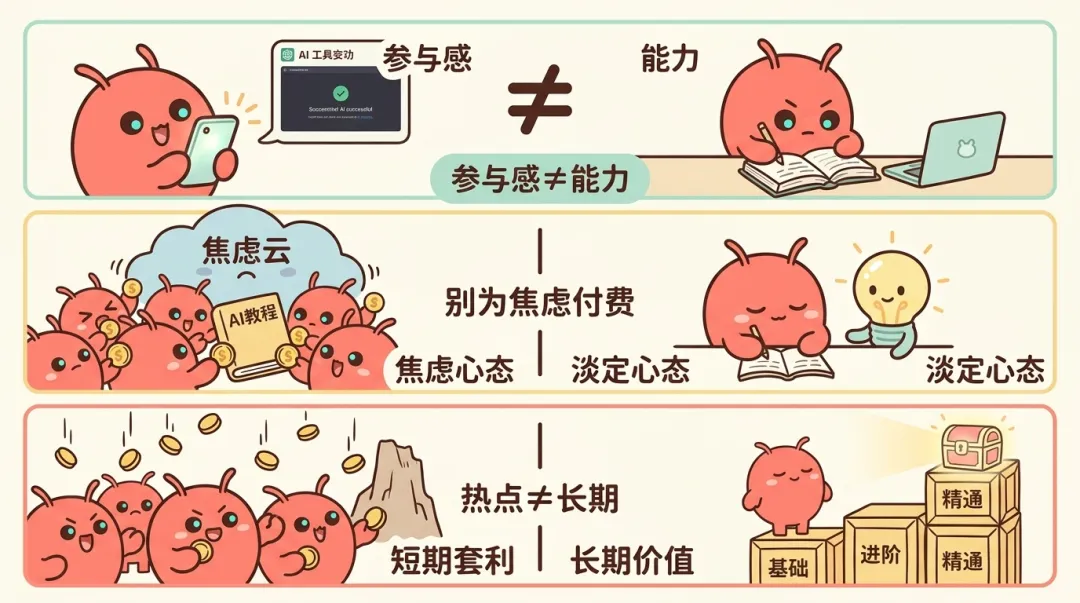 别一上来就买课、买部署服务(薅羊毛可以)、买“保姆级教程”,更别因为别人晒效果,你就觉得自己已经落后时代了。很多时候你不是落后,你只是还没冷静下来。