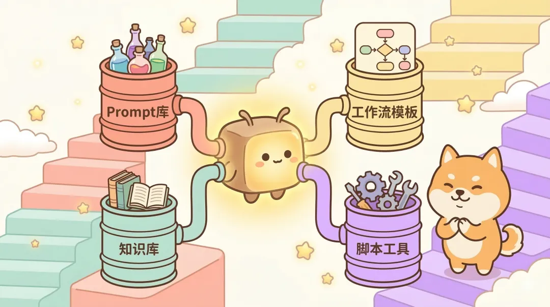 把常用 prompt 整理成自己的 prompt 库 把高频任务拆成固定工作流 把个人知识整理成可检索的知识库 把稳定可复用的步骤做成 skill、脚本或模板