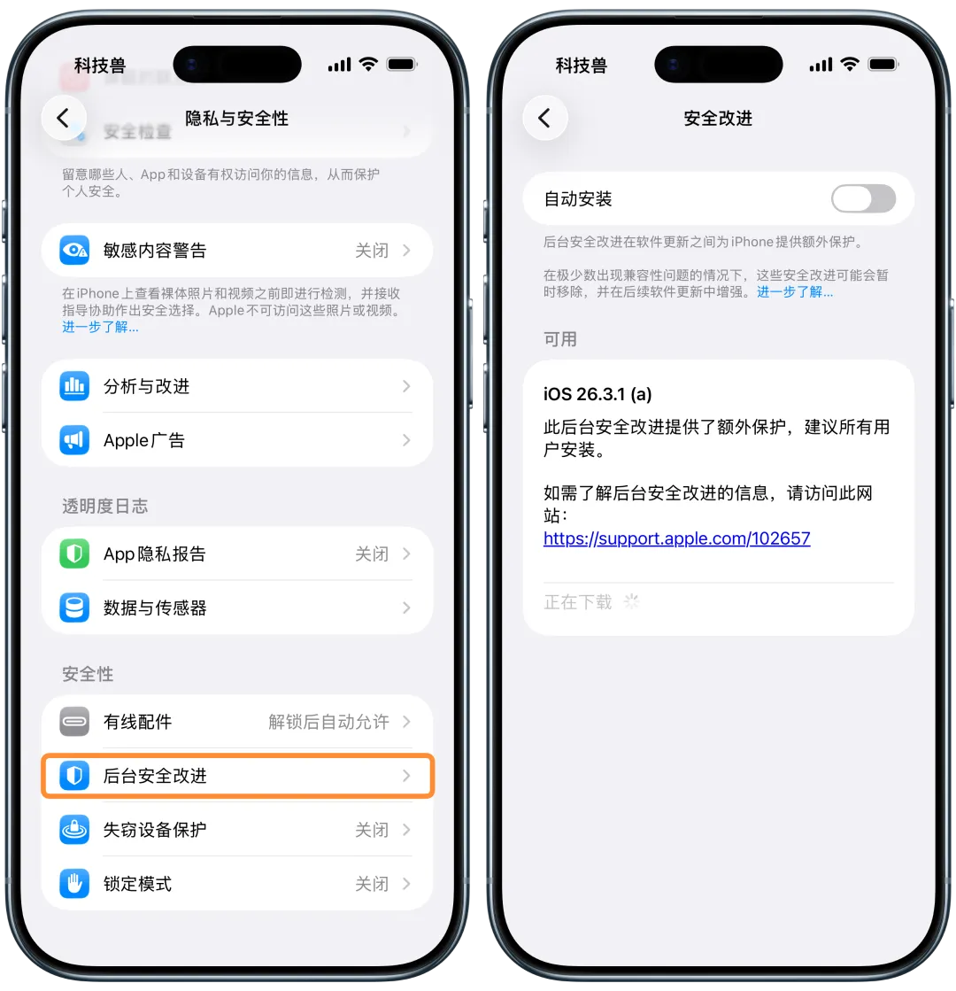 后台安全改进的核心作用,是针对 Safari 浏览器、WebKit 框架以及系统底层库进行轻量级补丁更新。因此,这类更新不会带来新功能或界面变化。