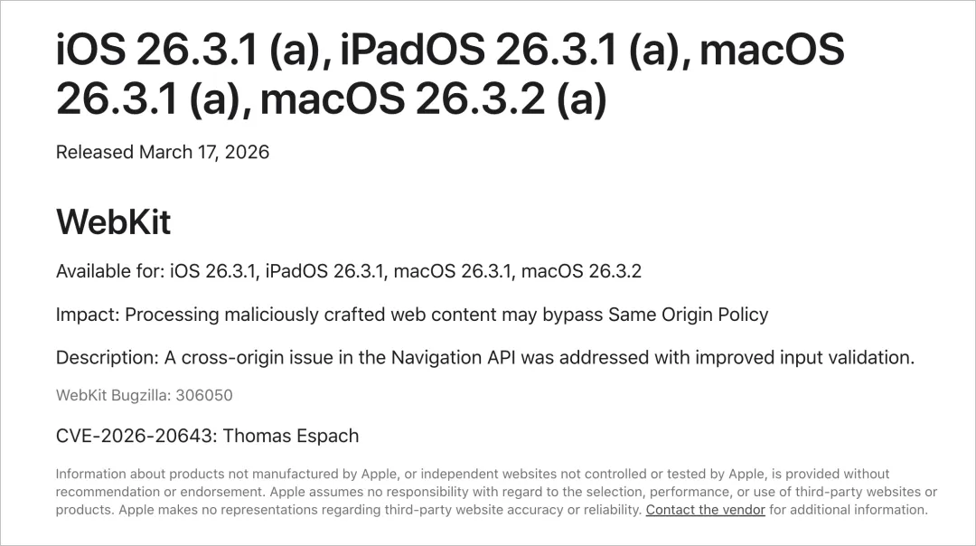 其中,iOS 26.3.1(a) 的版本号为 23D771330a。上述四个 BSI 更新主要修复一个 WebKit 漏洞:处理恶意构造的网页内容可能绕过同源策略(Same Origin Policy)。通过改进输入验证,修复 Navigation API 中的跨源问题