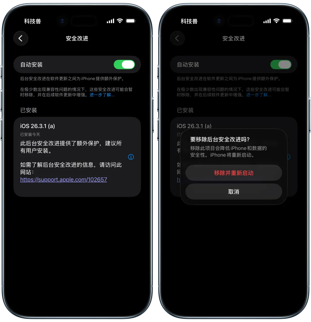 与传统系统更新不同,iOS 26.1 引入的后台安全改进还支持用户手动移除。移除后,设备会在重启后恢复到基础系统版本(例如 iOS 26.3.1)。