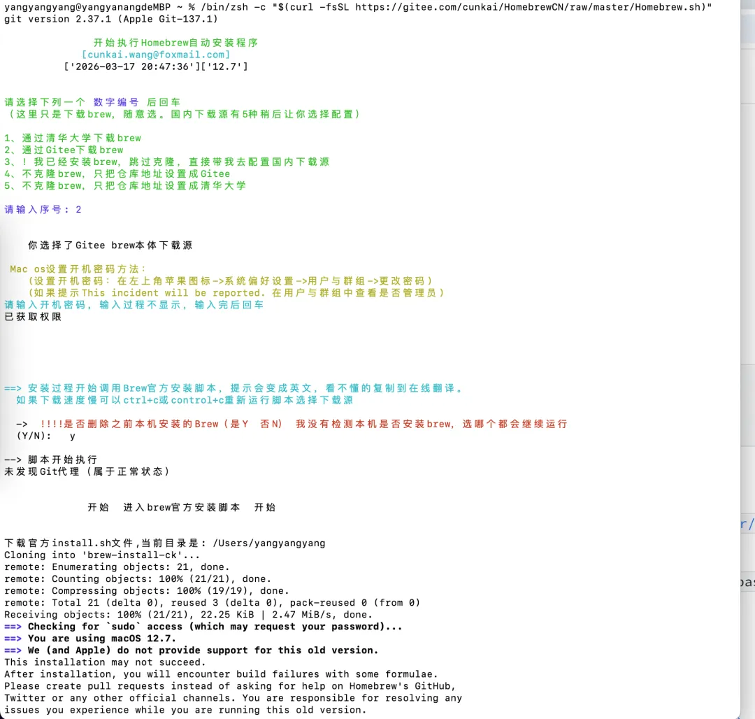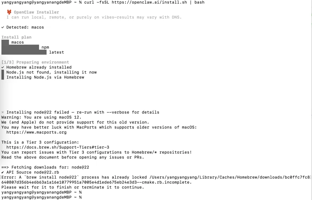 如果你的系统是 macOS 12(Monterey)或更低版本,脚本可能提示 Node.js 安装失败,需要额外操作: