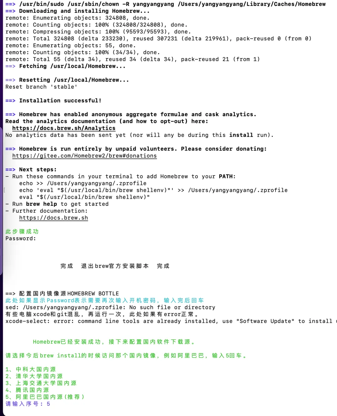 如果提示zsh: command not found: brew就是没装,输入以下命令,装一下(这个是国内镜像,速度更快)