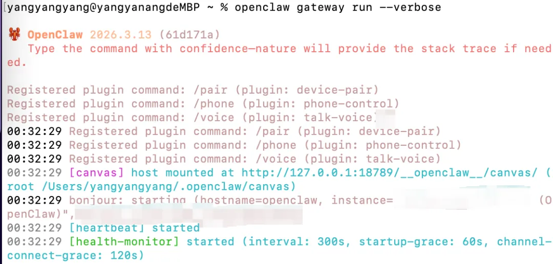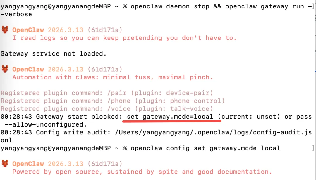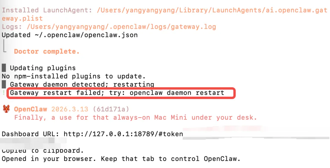 配置完成后,如果命令行里有提示 Gateway启动失败, 我们在终端执行命令,检查一下为什么启动失败