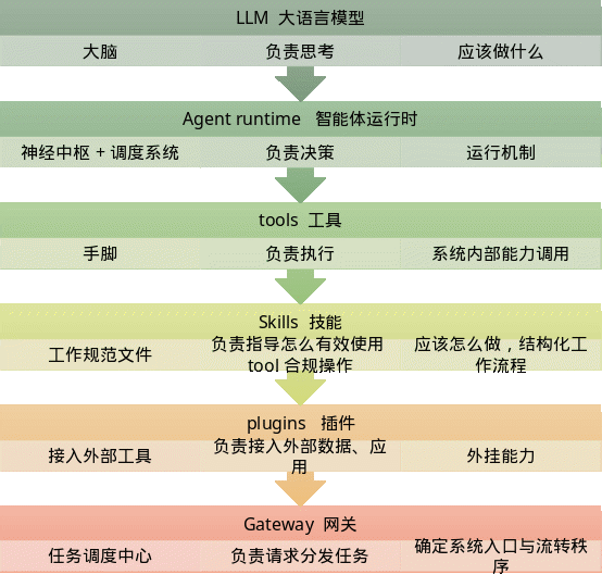 但一个优秀的秘书,仅有“会思考的大脑”是不够的。还需要有一套机制来决定: 先做什么、 后做什么、 在什么条件下执行、 调用哪些工具。这套机制,在 Open Claw 中被称为:Agent Runtime(智能体运行系统/时)。如果说 LLM 是“大脑”,那么 Agent Runtime 就是“神经中枢 + 调度系统”。