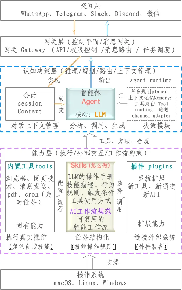 从工程角度看,这种结构类似于一个“智能体操作环境”:用户通过各种通信渠道进入系统,平台层负责协调和调度智能体,智能体以 LLM 为核心进行分析与决策,并通过能力层调用各种工具或插件完成真实任务。在这个过程中,通过 skills形成的规则和触发条件,让上面的行为合理有序。