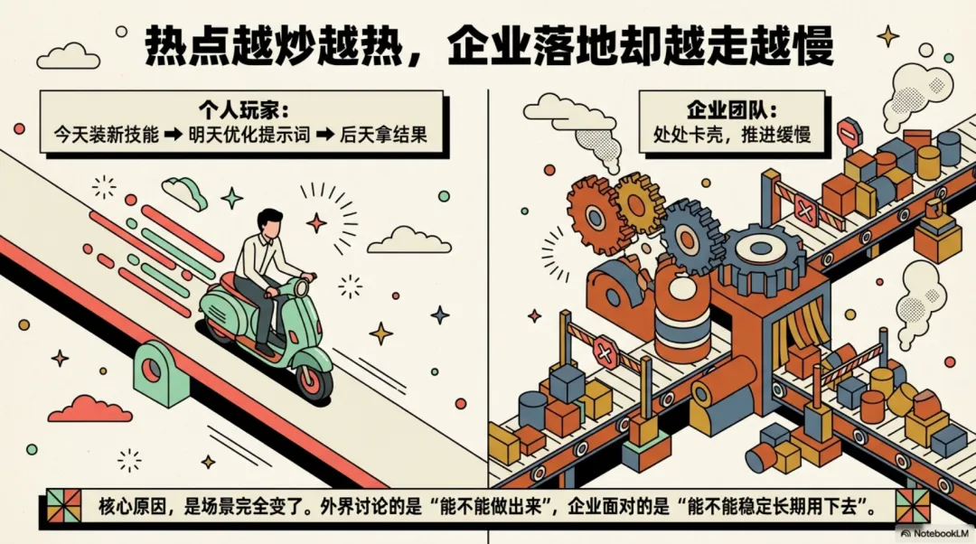 所以同样是用 AI 技能,个人先问的是能不能帮我提效,企业先问的是能不能放进SOP里。