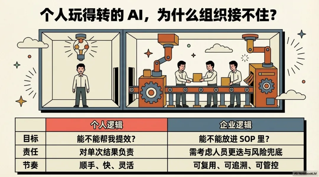 个人用 AI,只需要对自己的结果负责;但企业要的是可复用、可追溯、可管控的标准化流程,必须考虑人员更迭、规则调整、风险兜底等一系列超出单次操作的问题。
