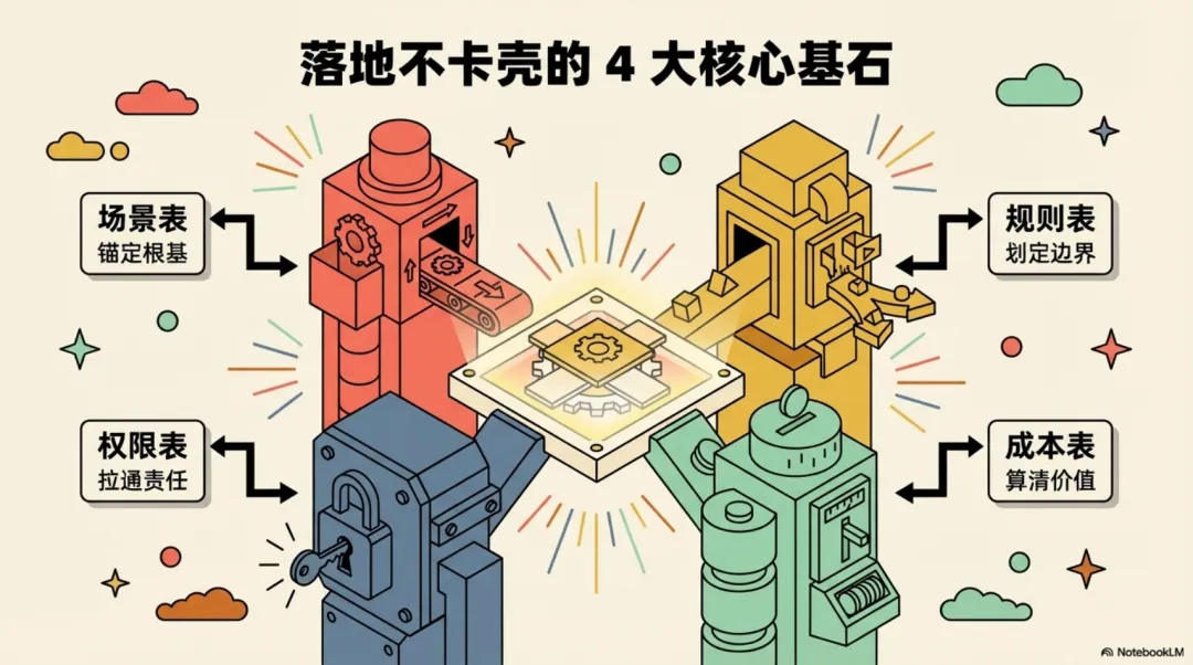 这套以 4 张表为核心的落地逻辑,帮企业把 AI 能力从零散的工具,变成了可沉淀、可复制的组织能力 —— 场景锚定了落地的根基,规则划定了运行的边界,权限拉通了责任的链条,成本算清了长期的价值。