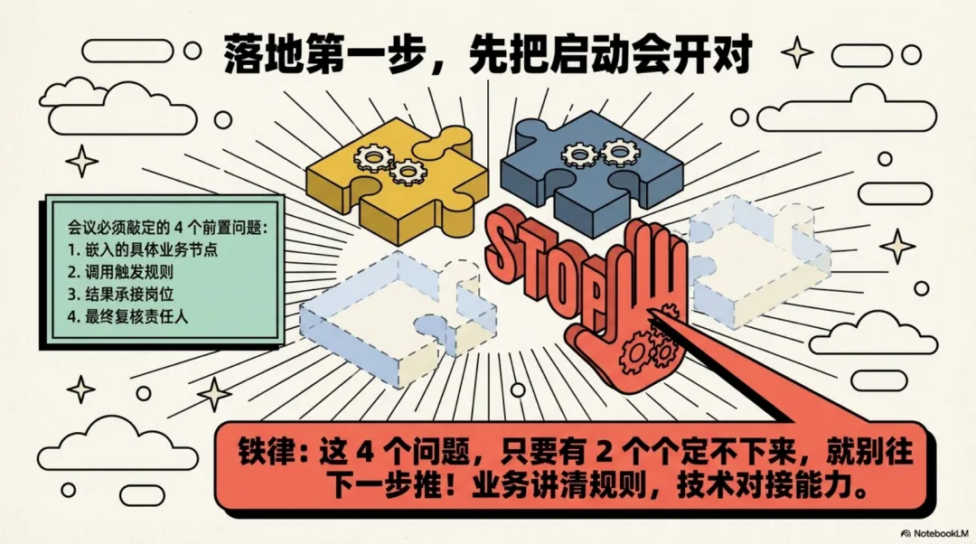 我的建议是:别急着讨论要做多少个 AI 技能,先敲定 4 个前置问题:这个能力要嵌入的具体业务节点、调用触发规则、结果承接岗位、最终复核责任人。