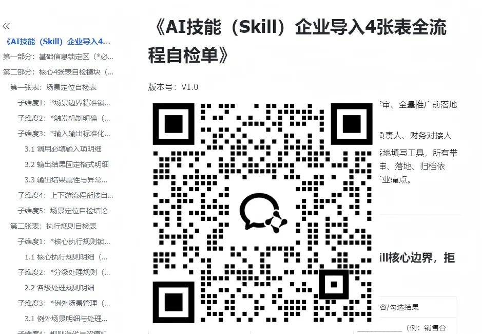 如果你的团队最近正准备开一次 AI 技能落地的内部会,带一张《AI 技能导入 4 张表自检单》,会比满屏的技术方案实用得多。