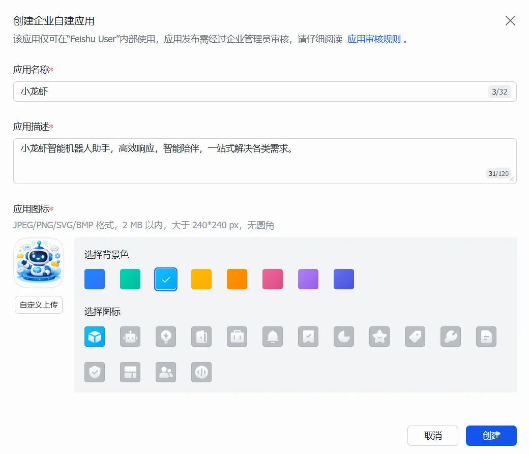 输入应用名称、应用描述,上传应用图标(可选),点击「创建」;