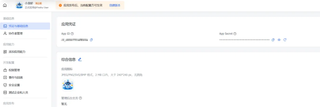 进入「凭证与基础信息」,找到并复制「App ID」和「App Secret」(保存好,后续要用,千万不要泄露哦);