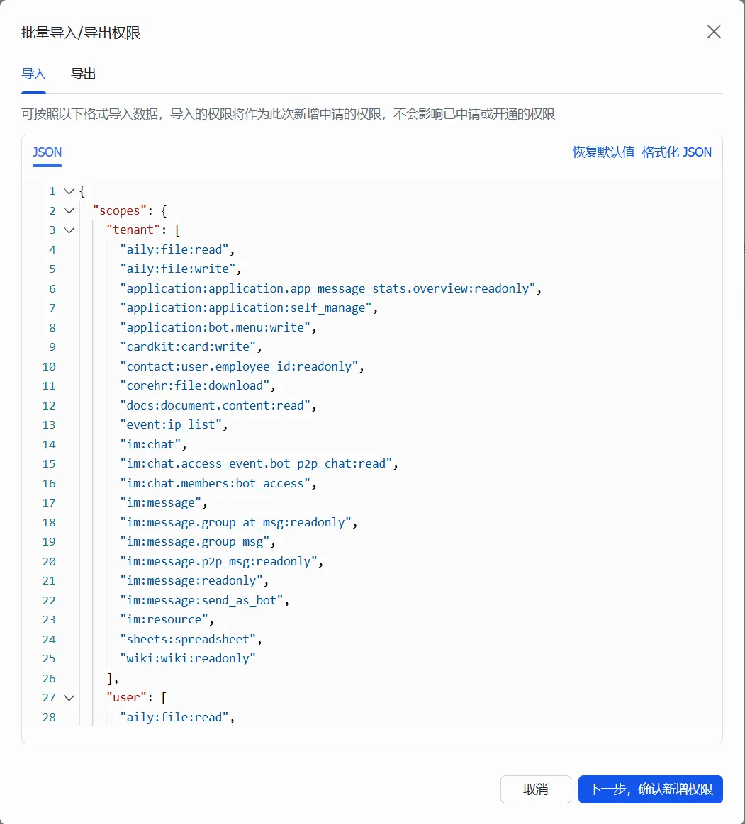 点击「批量导入权限」,将文章末尾附录1的JSON复制,并粘贴到下图所示的位置。点击「下一步,确认新增权限」,在后续依次出现的新窗口分别点击「申请开通」→ 「确认开通」→ 「确认」。