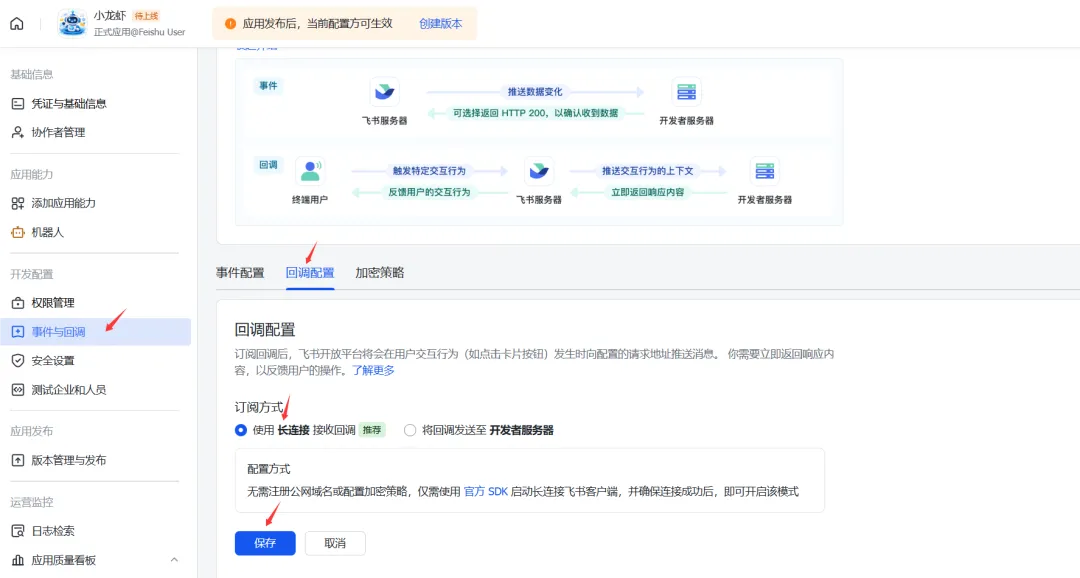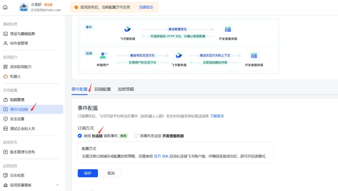 4. 此时,回到飞书开放平台。在应用左侧菜单栏,点击「事件与回调」。在「事件配置」中,选择长连接并保存。