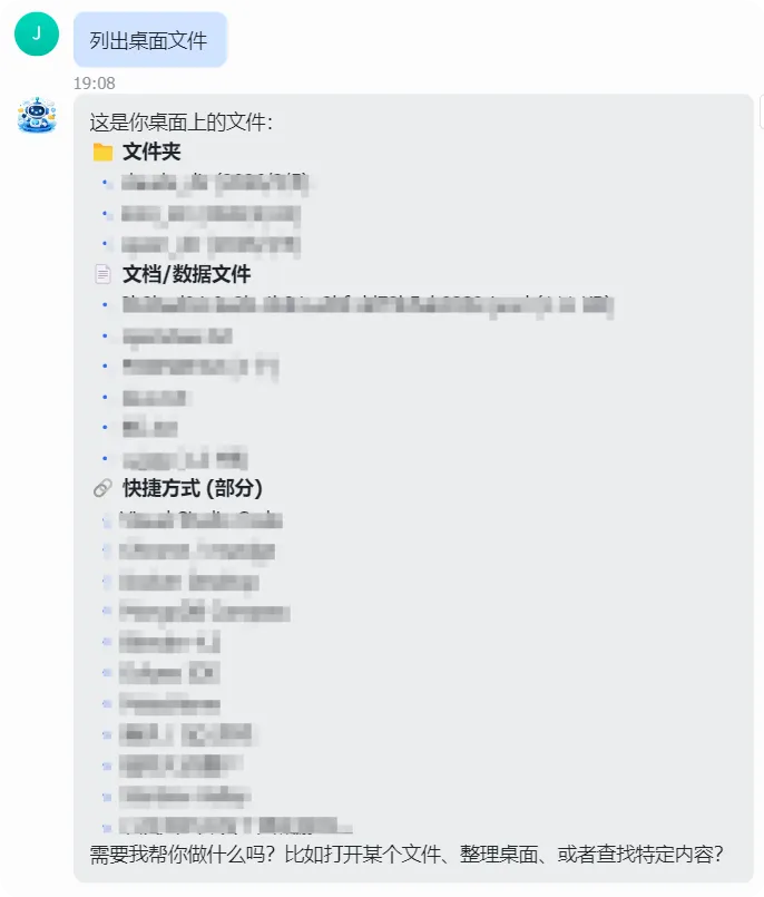 发送消息:“列出桌面文件”,等待机器人响应;