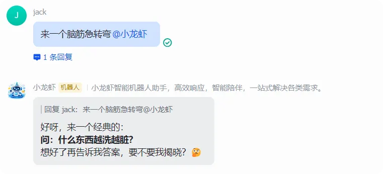 在群聊中@该飞书机器人,发送指令:“来一个脑筋急转弯”;