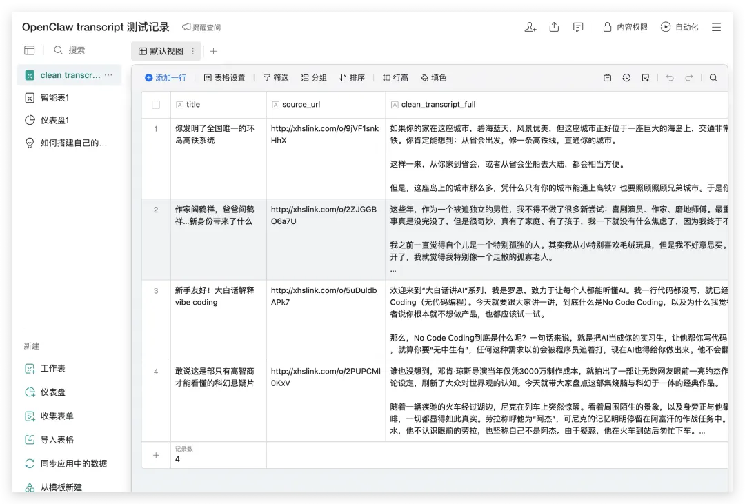 • 将小某书的视频链接发给OpenClaw🦞 • 让🦞下载这条视频 • 让🦞抽取音频 • 让🦞抽取音频中的文字(需要多模态大模型,性价比最高的可能是"google/gemini-3.1-flash-lite-preview",可以通过OpenRouter调用,需要配置OpenRouter的API Key) • 要求🦞对文本进行清洗,然后进行二次加工,例如:生成思维导图、生成PPT、风格化改写、等等 • 以上所有内容通过企微“智能表格”来管理和中转