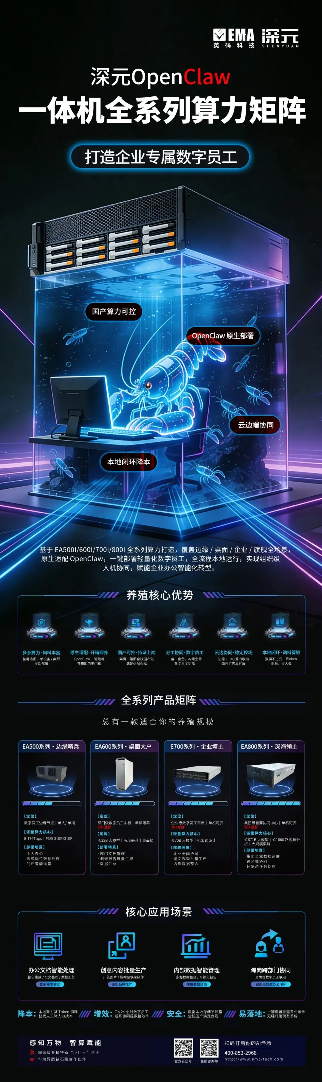 深元 OpenClaw 一体机全系列算力矩阵・打造企业专属数字员工# end关于英码科技广州英码信息科技有限公司成立于2006年,专注云-边-端协同的AI计算产品与行业应用方案。公司总部坐落于广州,经过多年技术积累与产业实践,英码科技已成长为国家级专精特新“小巨人”企业,并获广东省科学技术厅认定为广东省人工智能与边缘计算工程技术研究中心。作为业内较早布局算力硬件研发与产业化的企业,英码科技深耕智能硬件领域,与产业伙伴保持深度合作,是昇腾钻石合作伙伴、鲲鹏金牌合作伙伴及华为优选级解决方案开发伙伴,持续推动AI计算产品在行业场景中的落地应用。 扫一扫 你的AI咨询师 / 英码科技自媒体矩阵 /戳下面的原文阅读,了解更多!